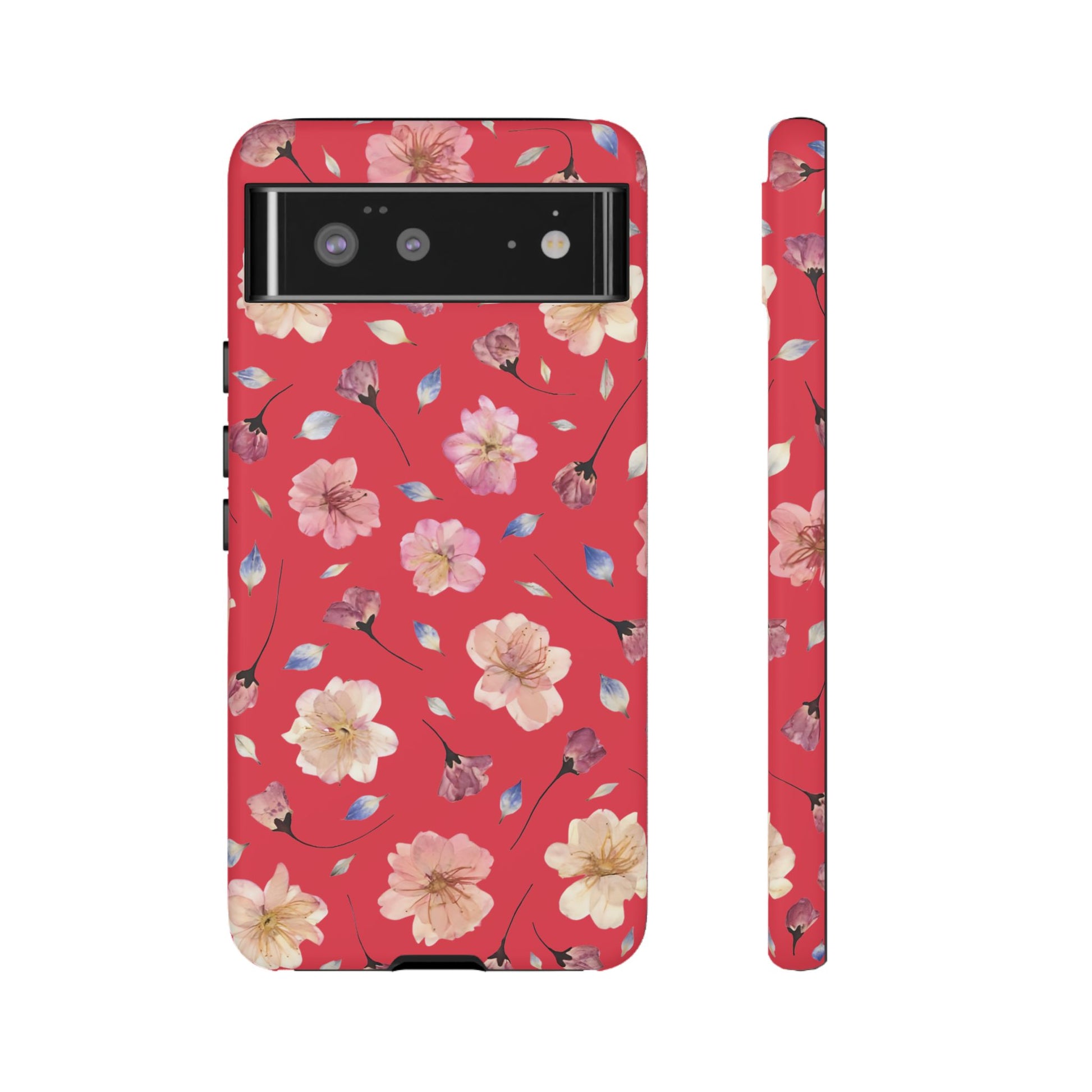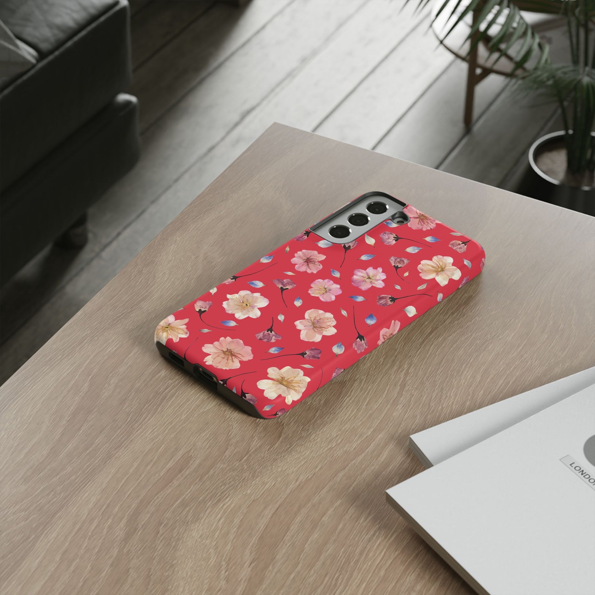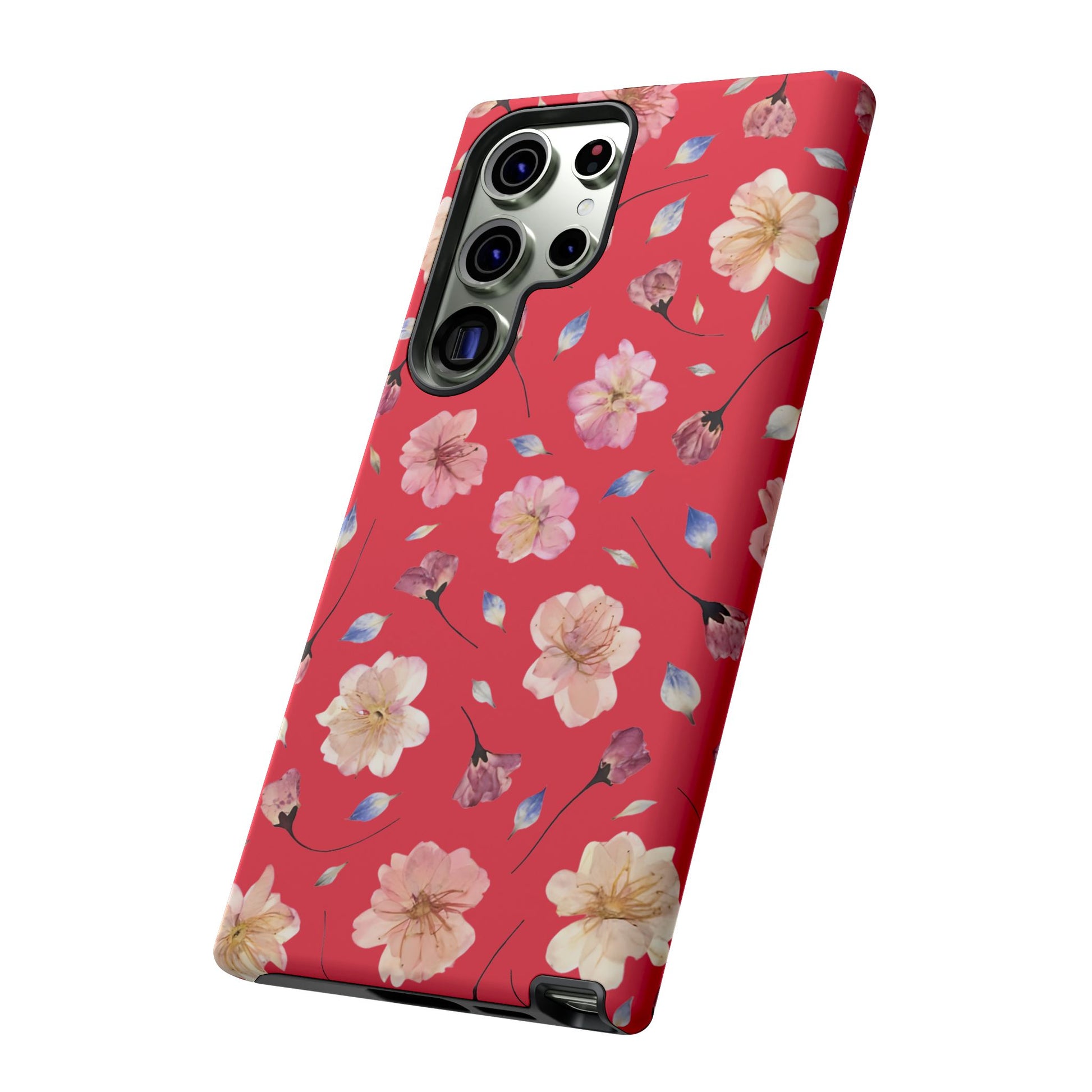 Coque Téléphone Samsung, iPhone & Google Pixel Renforcée Mate – Design Floral Fleurs de Cerisier sur Fond Rouge Féminin | Protection Antichoc | Idée Cadeau Femme
