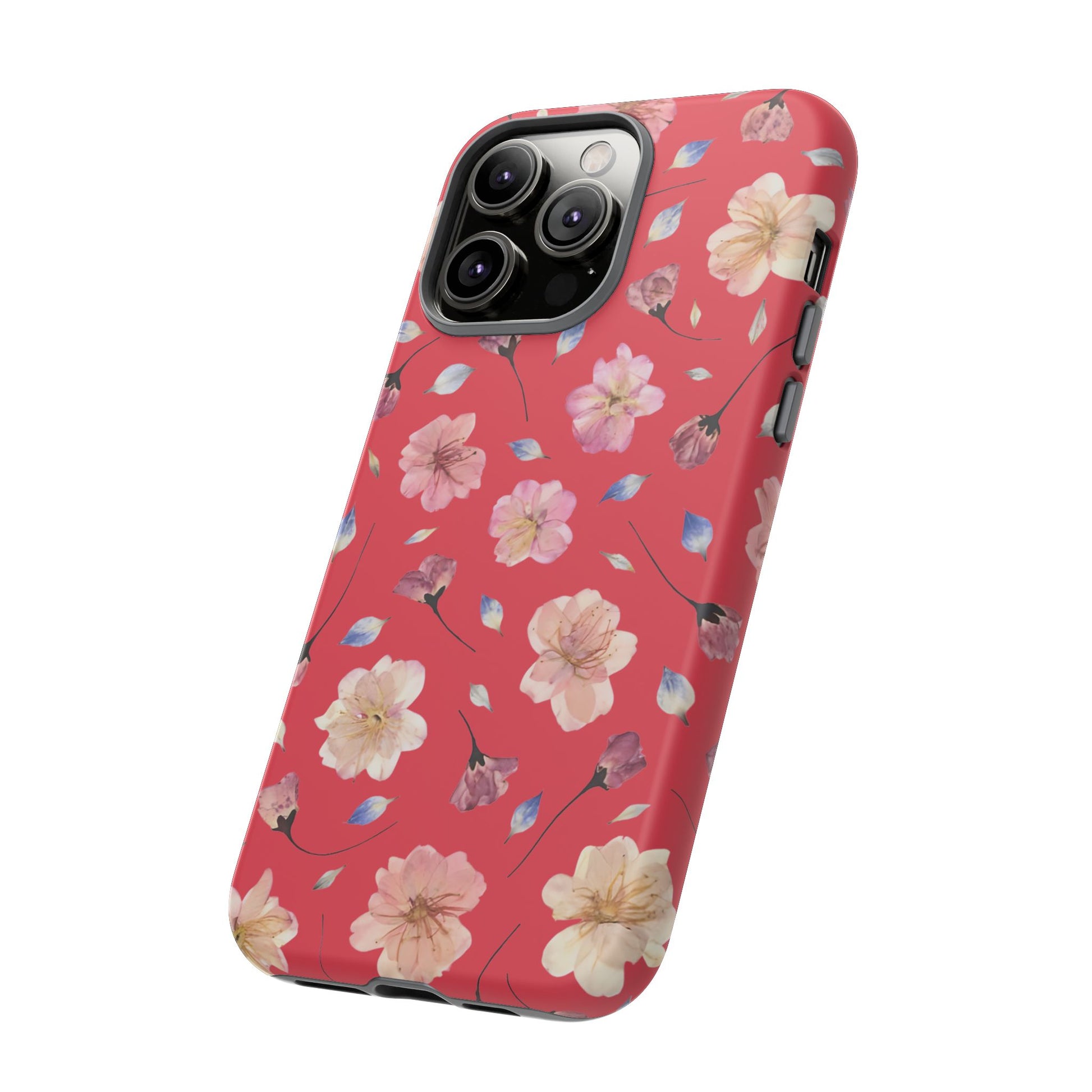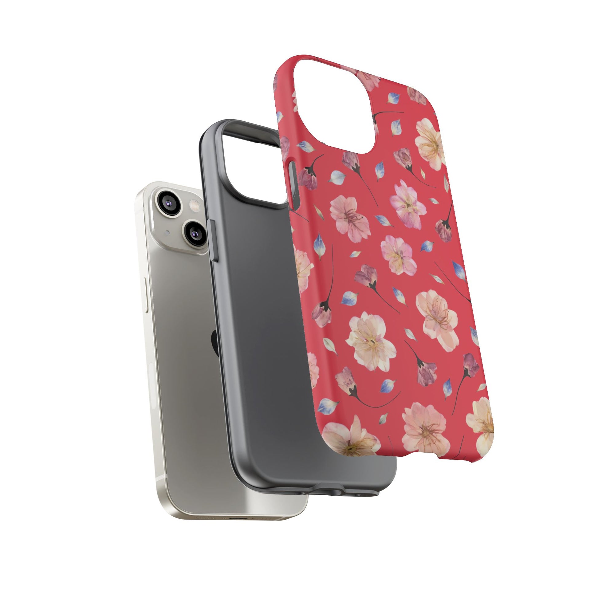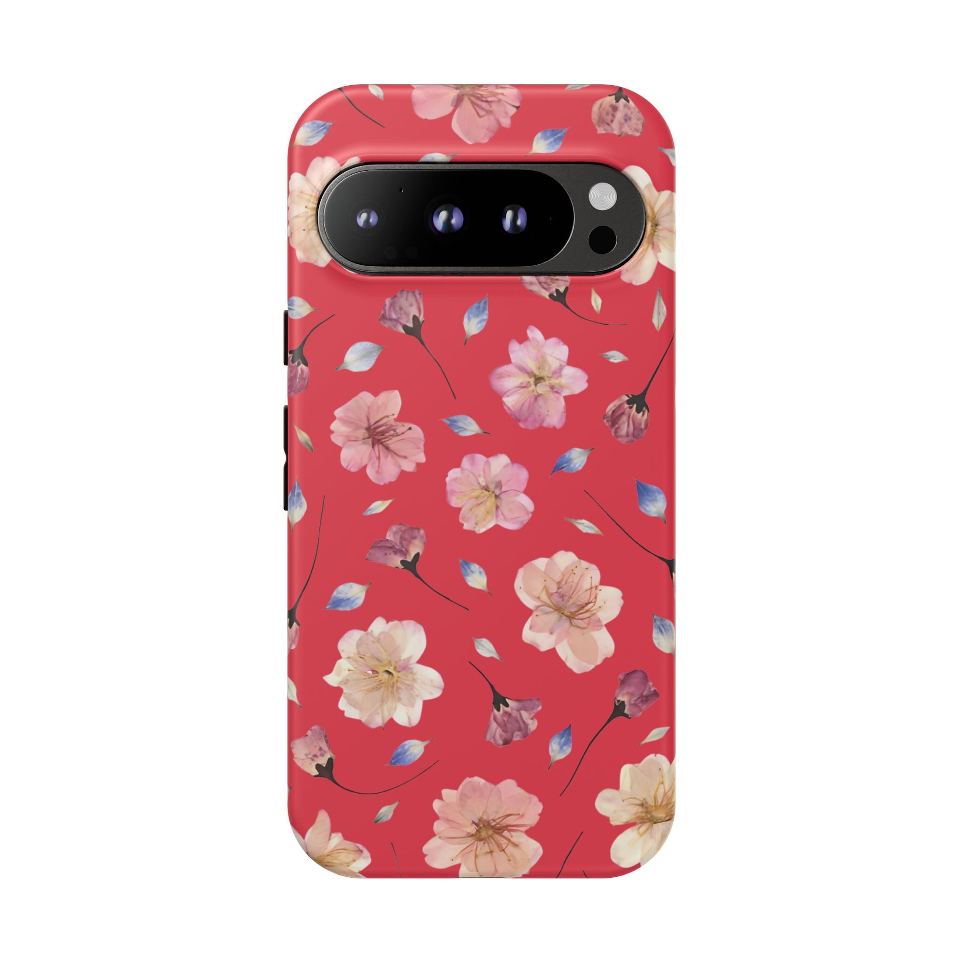 Coque Téléphone Samsung, iPhone & Google Pixel Renforcée Mate – Design Floral Fleurs de Cerisier sur Fond Rouge Féminin | Protection Antichoc | Idée Cadeau Femme