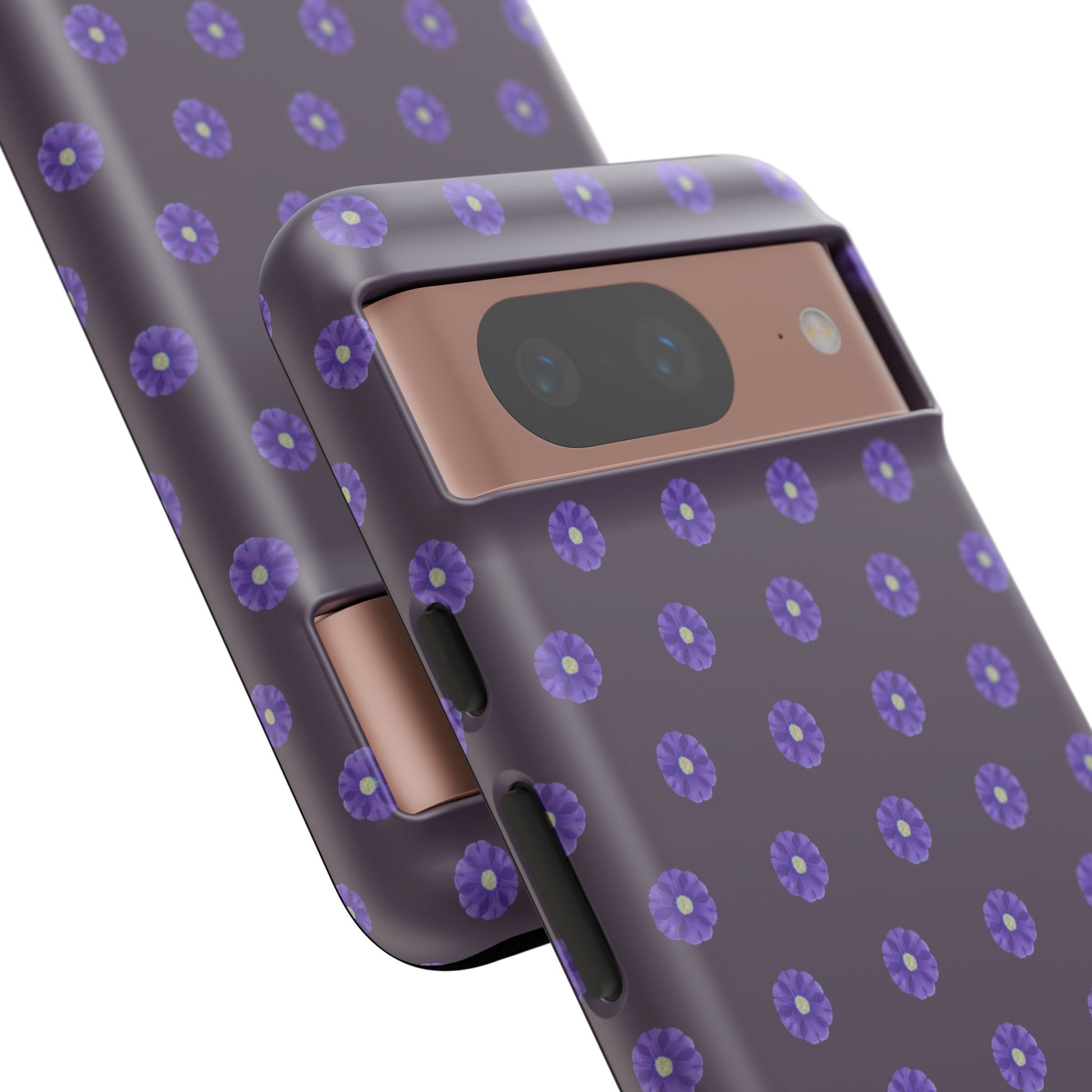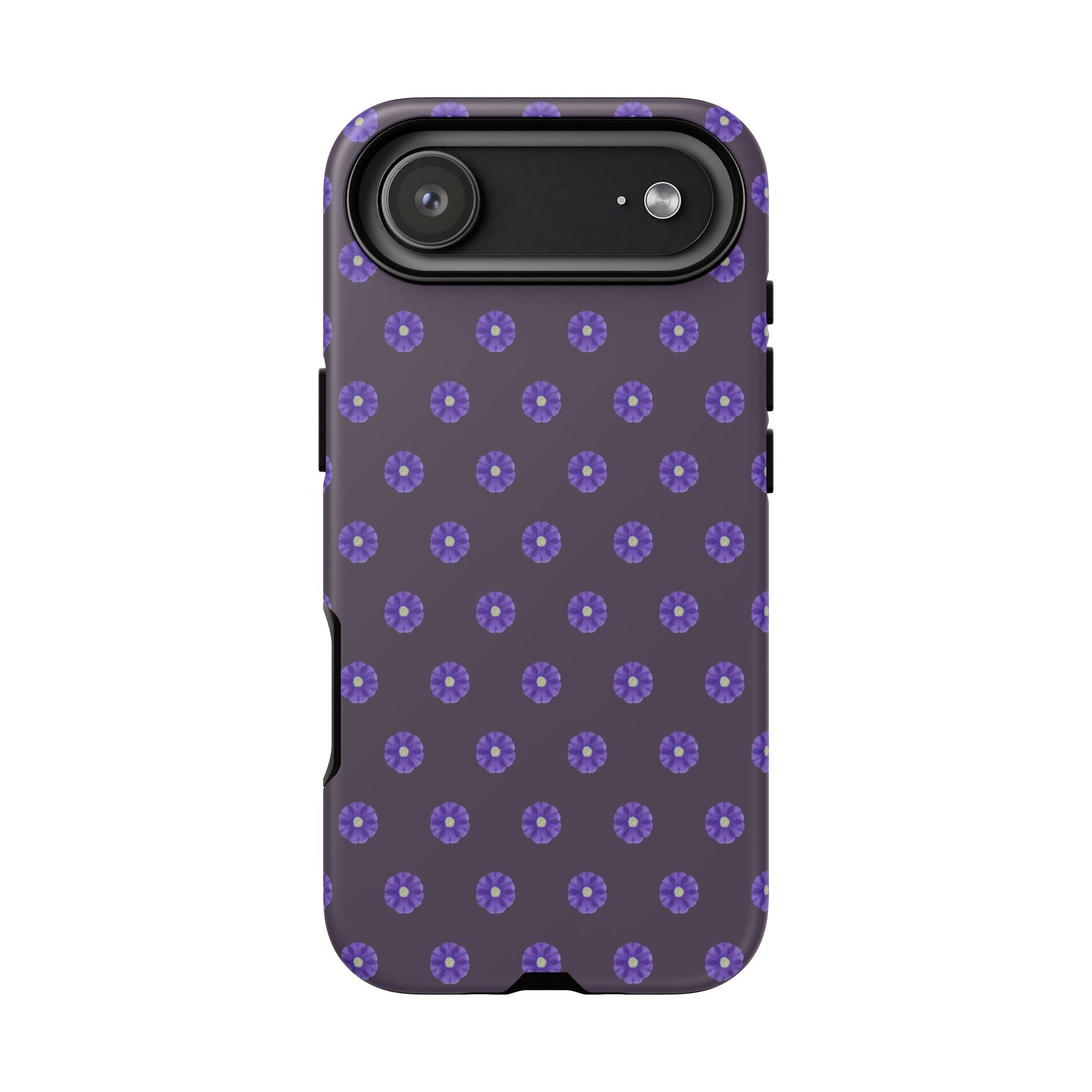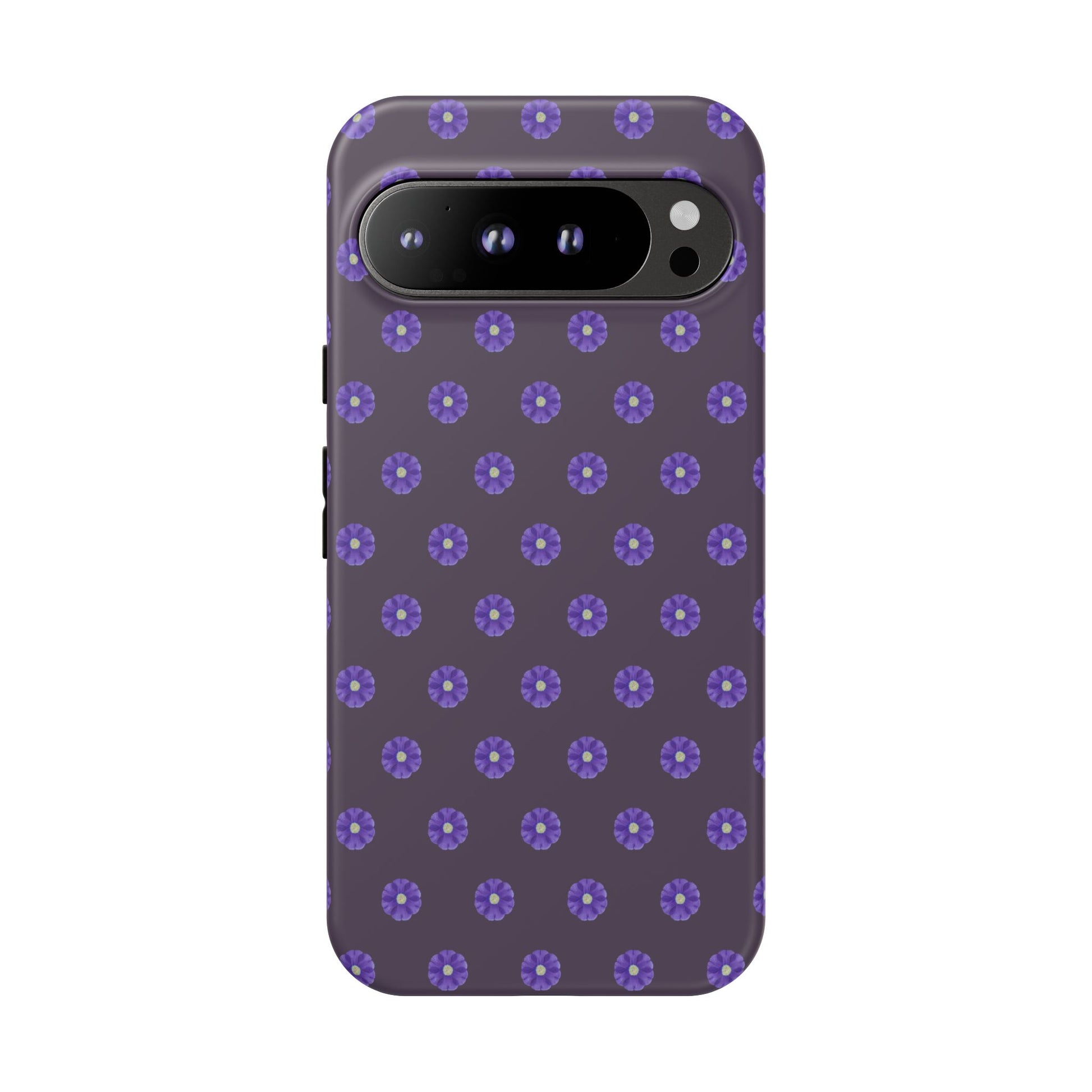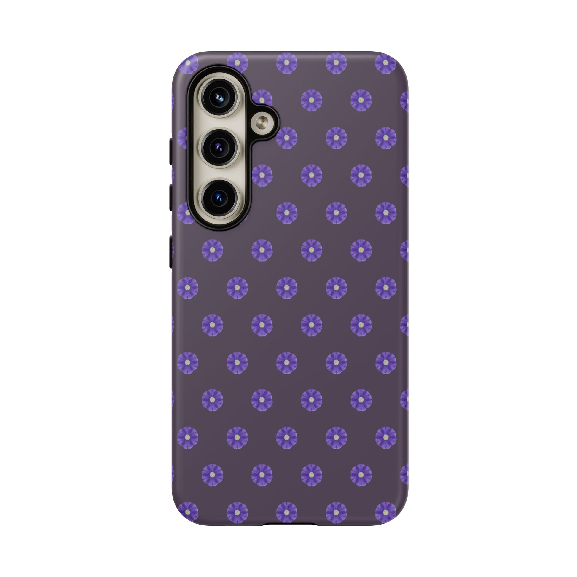 Coque Téléphone Samsung, iPhone & Google Pixel Renforcée Mate – Design Floral Epuré Fleurs de Primevère sur Fond Couleur Prune| Protection Antichoc | Idée Cadeau Femme