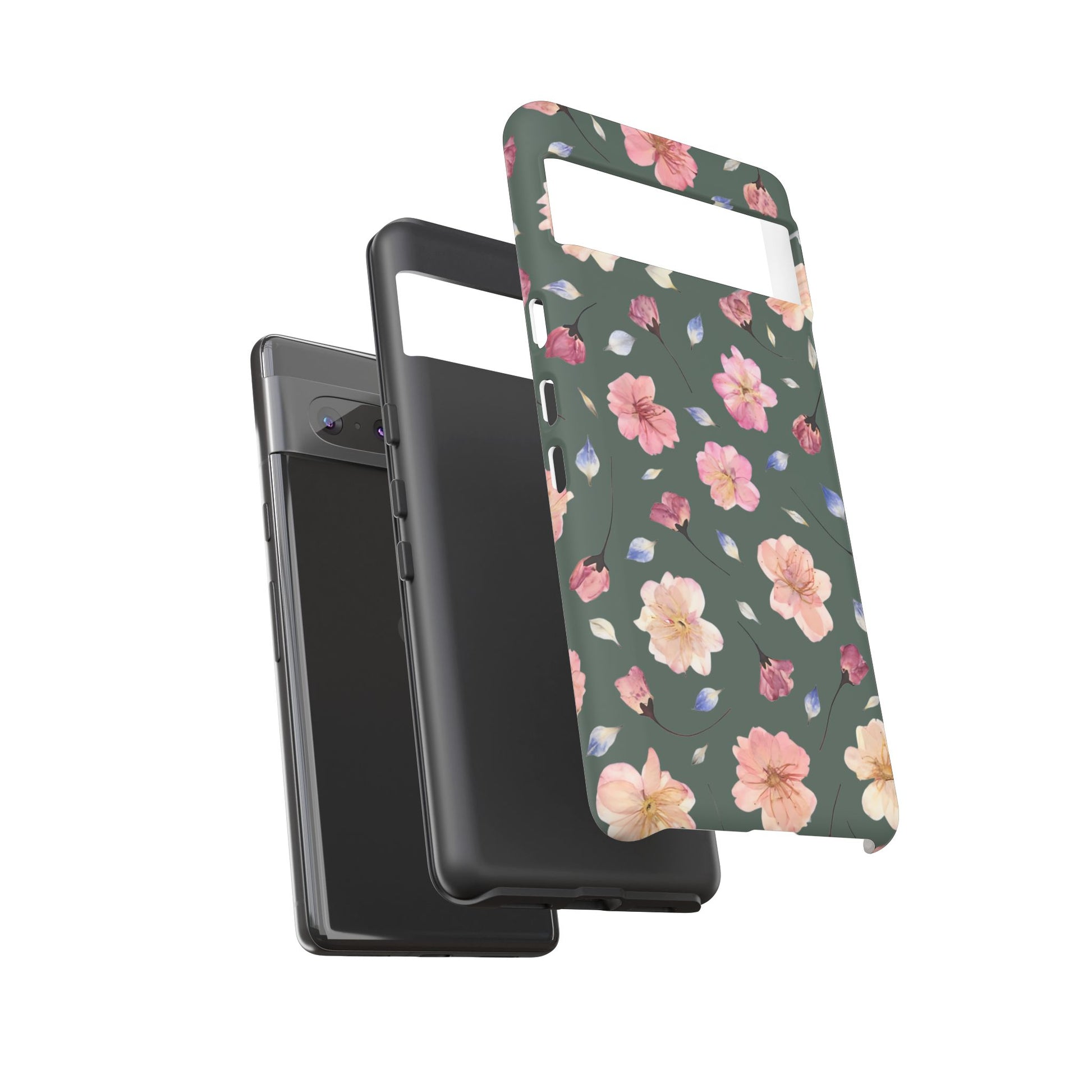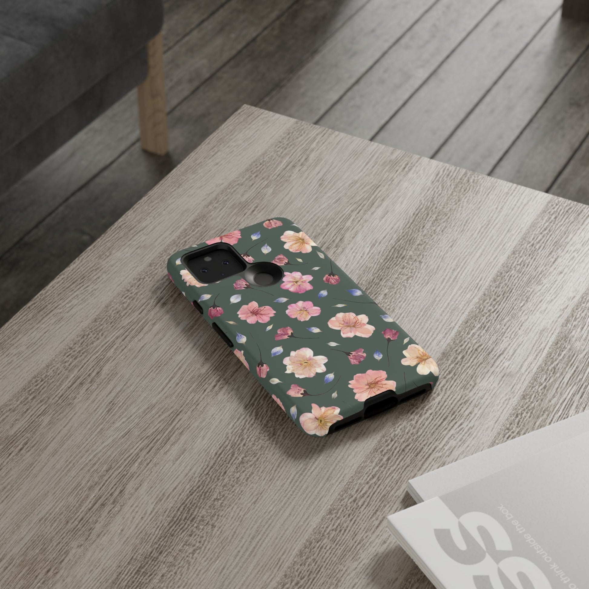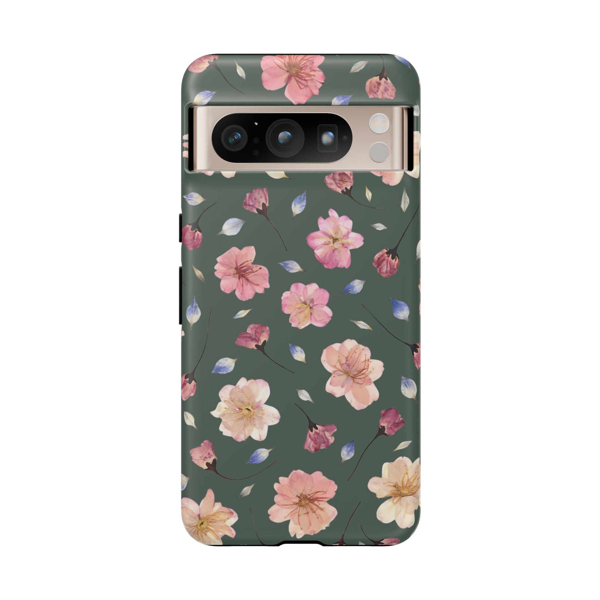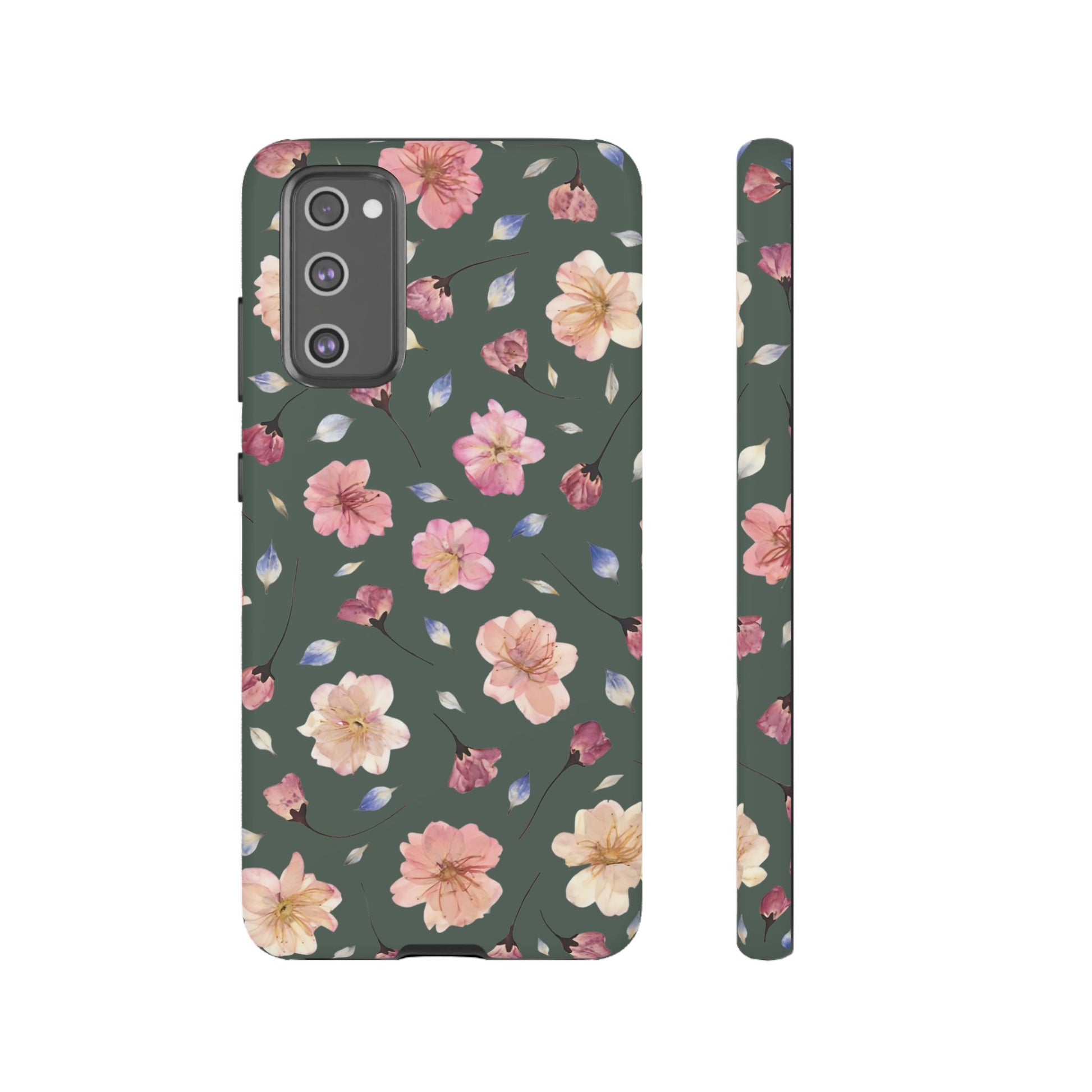 Coque Téléphone Samsung, iPhone & Google Pixel Renforcée Mate – Design Floral Fleurs de Cerisier sur Fond Verte Minéral | Protection Antichoc | Idée Cadeau Femme