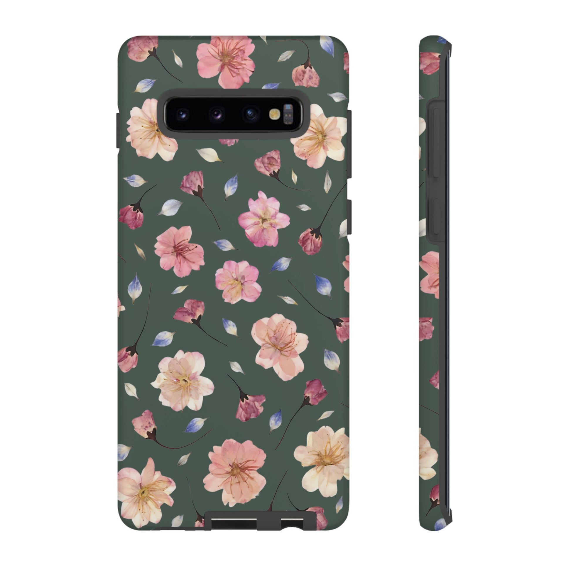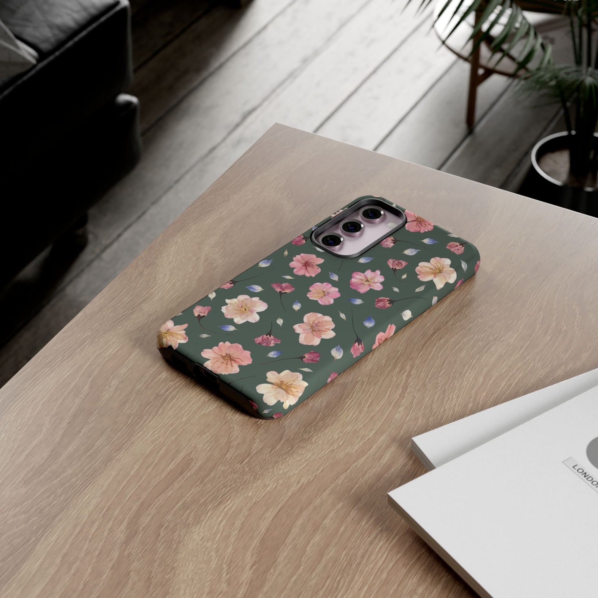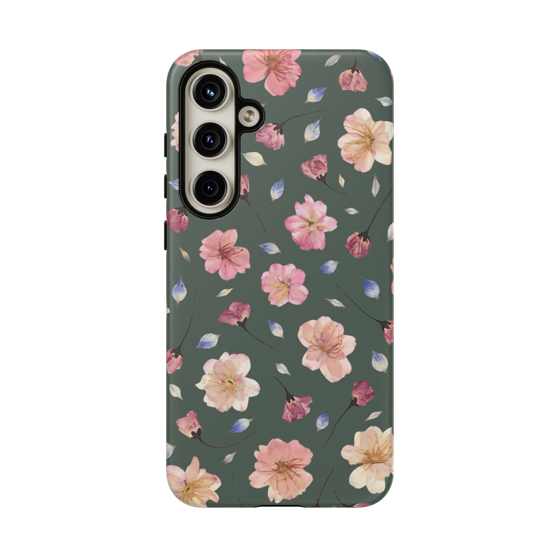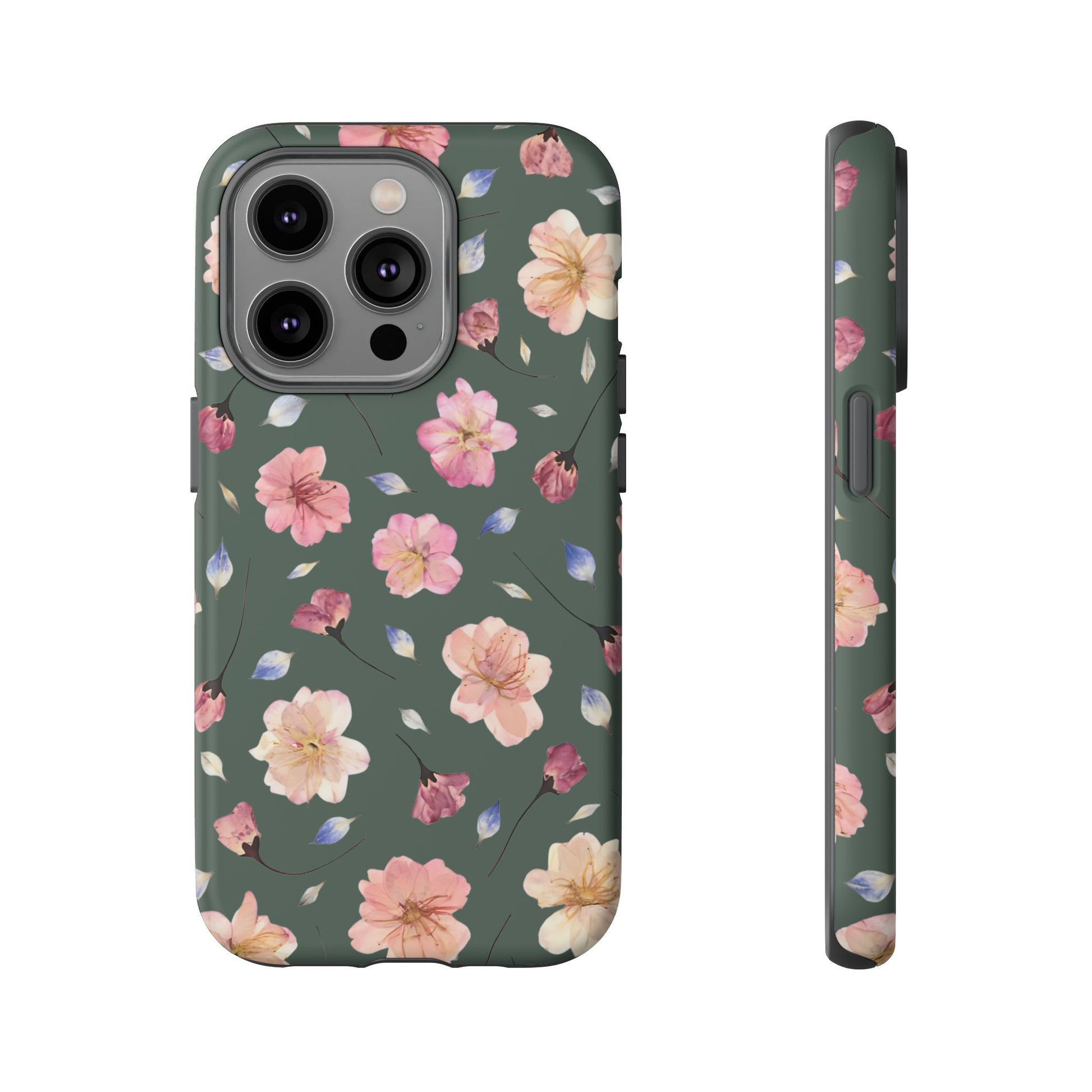 Coque Téléphone Samsung, iPhone & Google Pixel Renforcée Mate – Design Floral Fleurs de Cerisier sur Fond Verte Minéral | Protection Antichoc | Idée Cadeau Femme