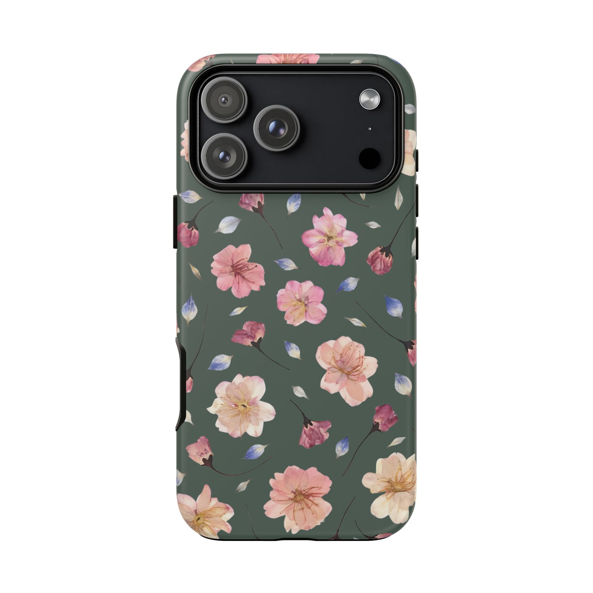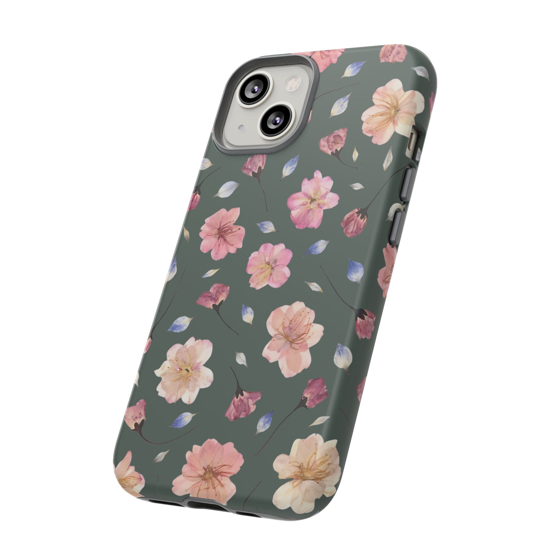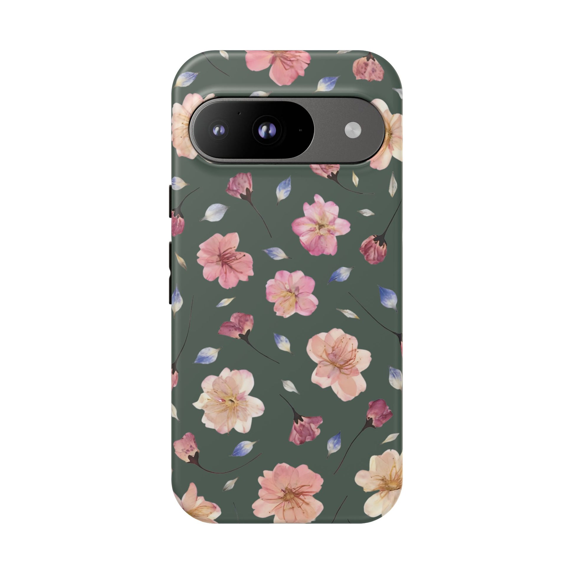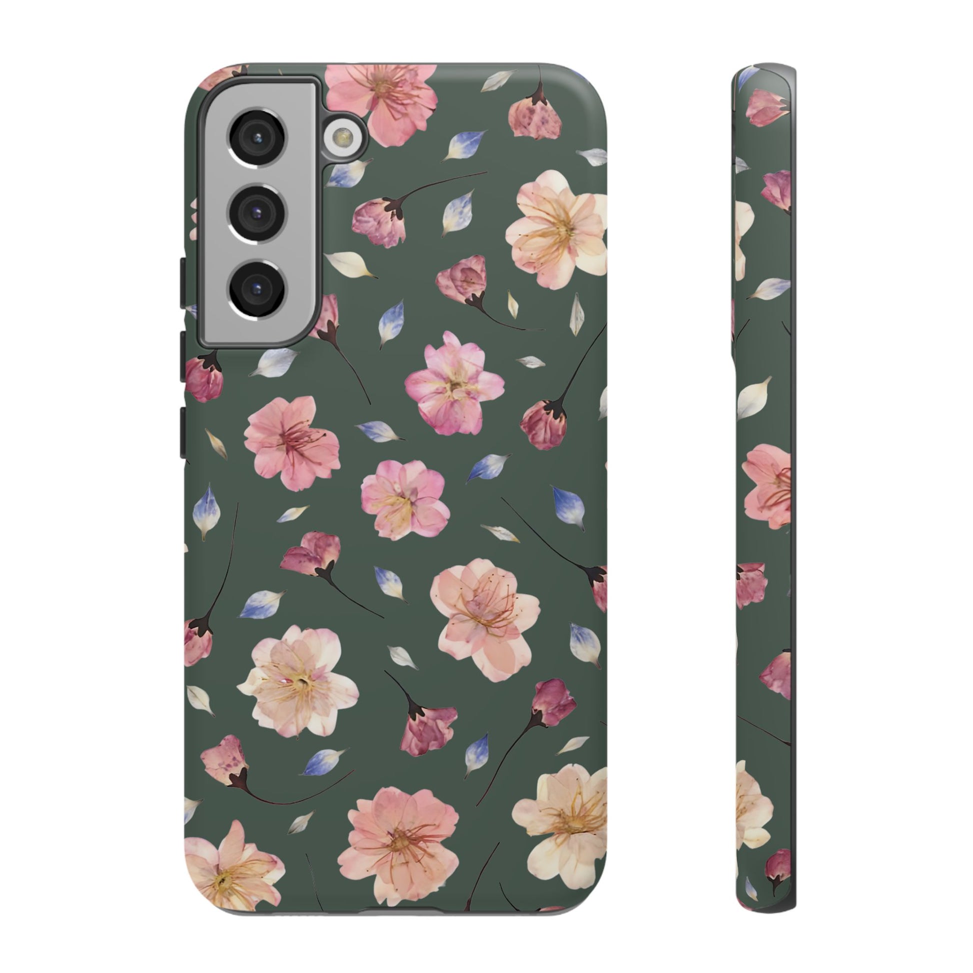 Coque Téléphone Samsung, iPhone & Google Pixel Renforcée Mate – Design Floral Fleurs de Cerisier sur Fond Verte Minéral | Protection Antichoc | Idée Cadeau Femme